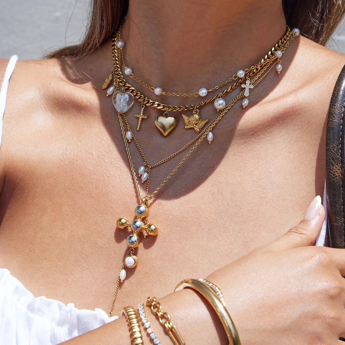 The charm of the coast, captured in a layered set. Sienna’s Jasmine combines luminous pearls, golden icons, and textured chains to create a bundle that’s bold yet versatile. Wear it together for a statement or split the pieces for subtle accents.