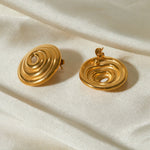 Capture a miniature golden vortex on your ears with the Eliah Gold Earrings. Their 18k gold construction boasts a captivating spiral pattern within a rounded form, adding a touch of hypnotic elegance to any ensemble.