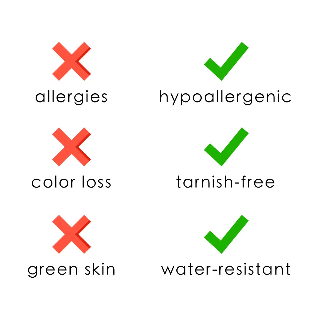 We make our jewelry with the best stainless steel and coat it with 18k gold using a cool technique called PVD (Physical Vapor Deposition). This is a new and better way of coating that makes the gold layer super thick, eco-friendly and strong.